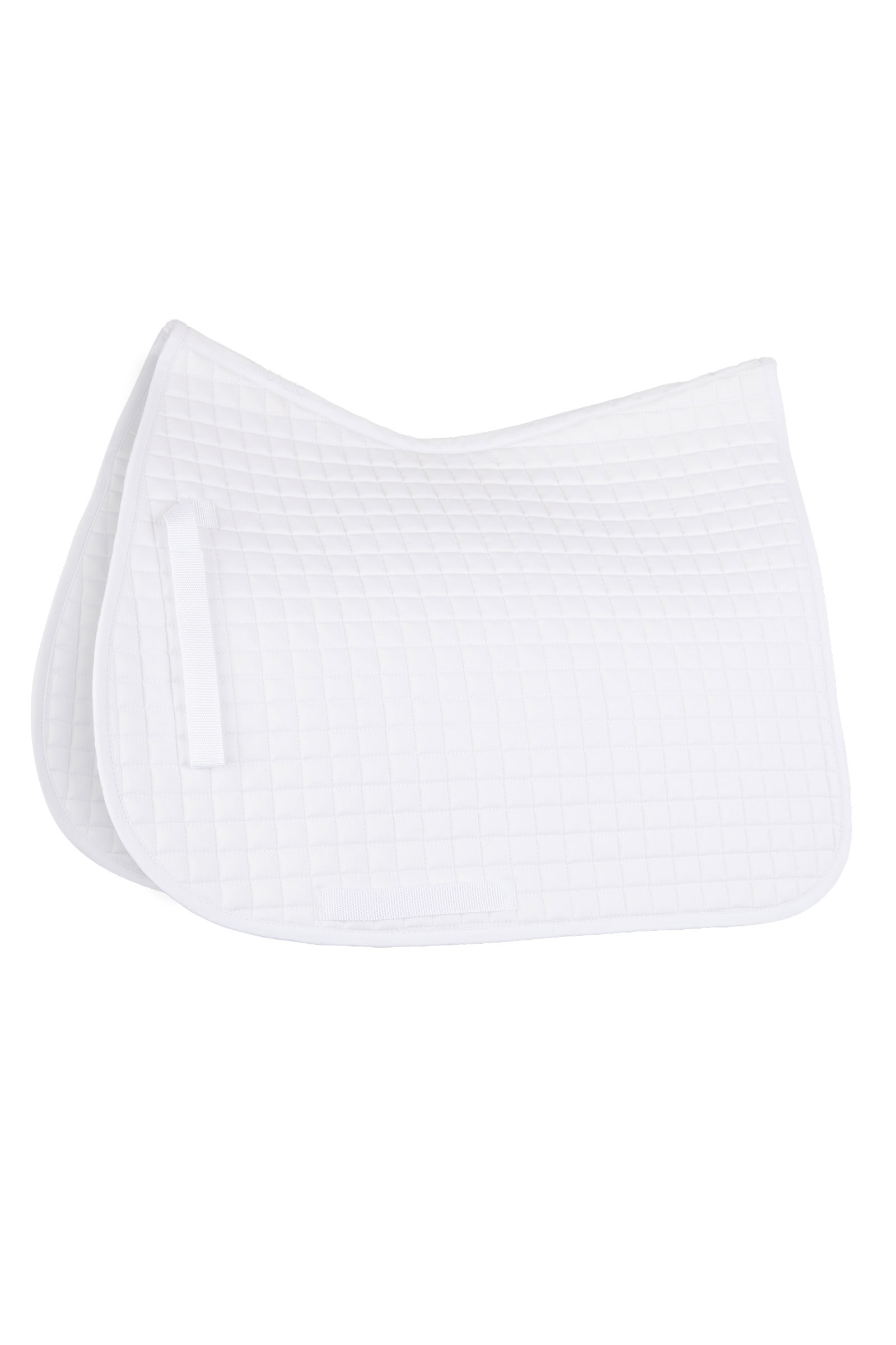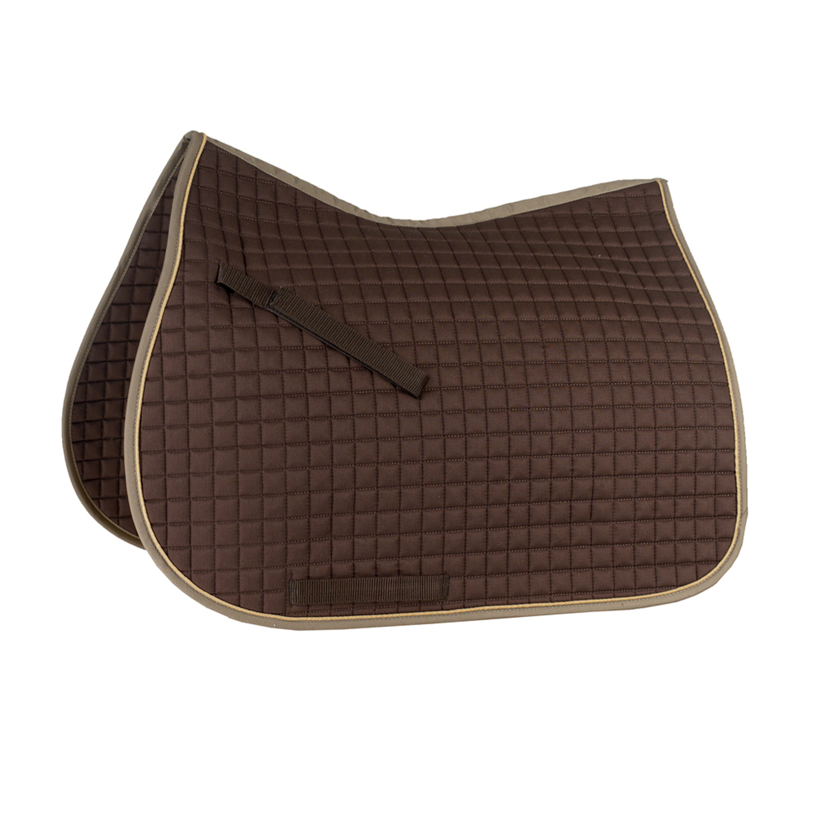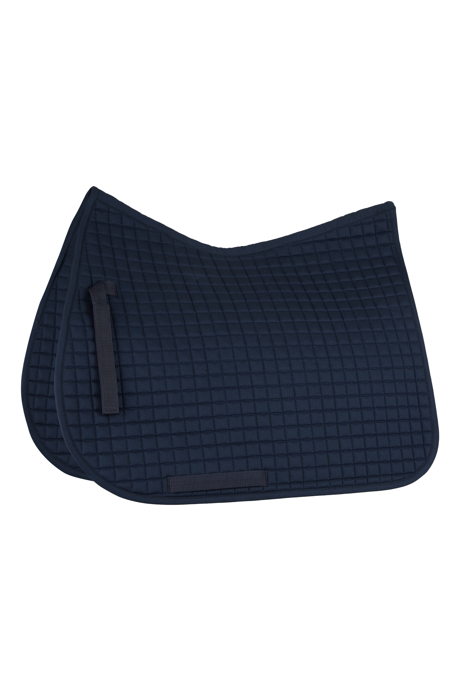 Well designed with special attention to details, this all-purpose saddle pad is extremely comfortable with a contoured shape for optimal fit and poise. Tiny 1 cm square quilting, high thread count and impeccable stitching set this pad apart from others. Cotton lining with foam and polyfill aids with back comfort and allows air to circulate keeping horses cool. Reinforced nylon billet straps have hook and loop fasteners for easy use. The Horze River All Purpose Saddle Pad is not only functional but also visually appealing. Beautiful piping along the binding defines the shape with embroidery at the wither. This adds to the clean, polished look. Well designed with special attention to detail, this is an excellent choice for a high quality pad without the high price tag. Add embroidery for a custom look.
