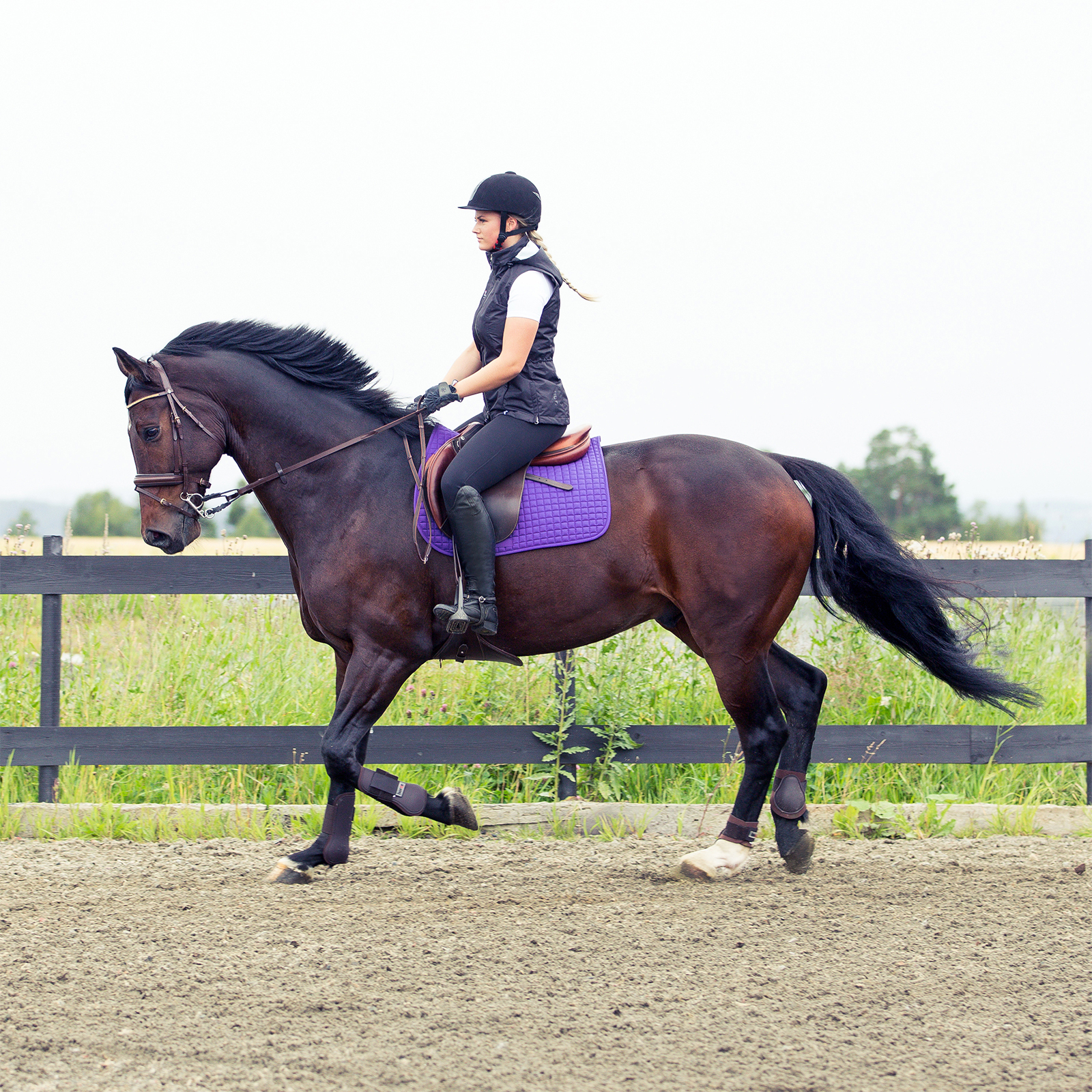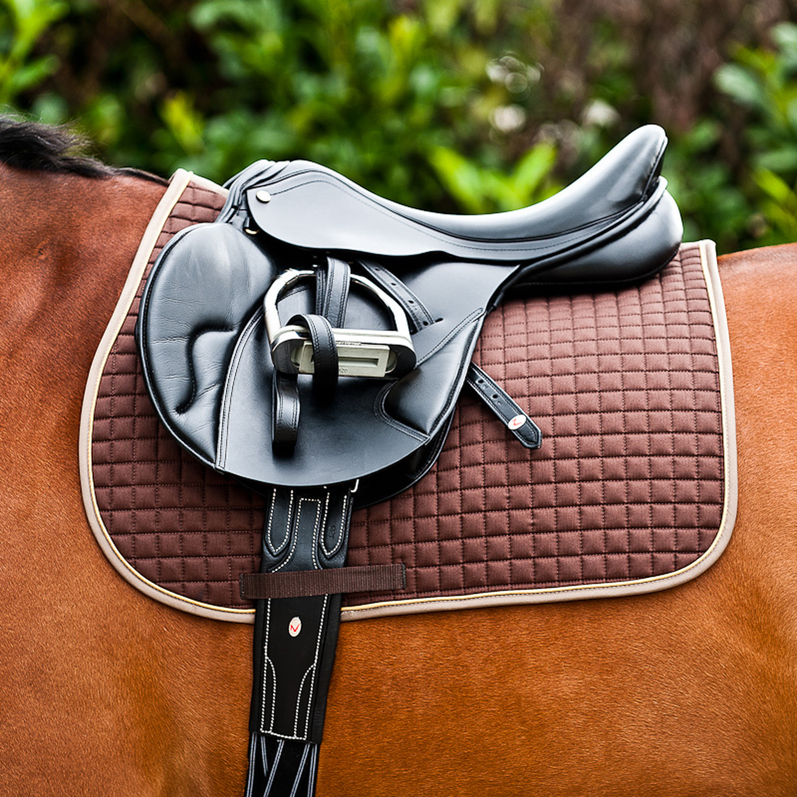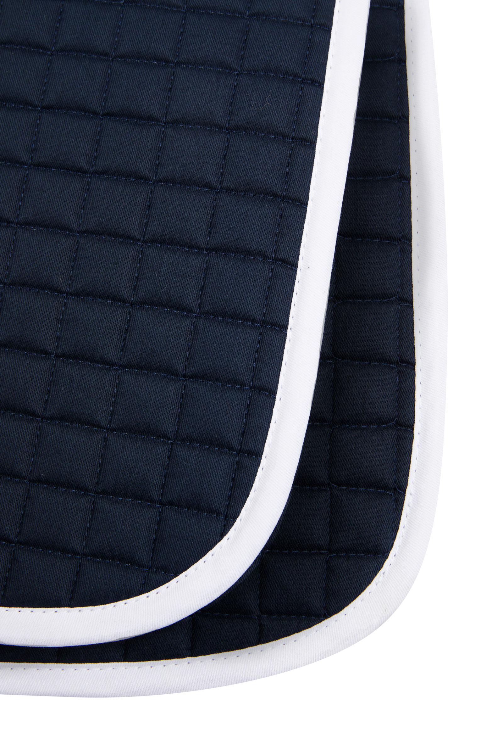 Well designed with special attention to details, this all-purpose saddle pad is extremely comfortable with a contoured shape for optimal fit and poise. Tiny 1 cm square quilting, high thread count and impeccable stitching set this pad apart from others. Cotton lining with foam and polyfill aids with back comfort and allows air to circulate keeping horses cool. Reinforced nylon billet straps have hook and loop fasteners for easy use. The Horze River All Purpose Saddle Pad is not only functional but also visually appealing. Beautiful piping along the binding defines the shape with embroidery at the wither. This adds to the clean, polished look. Well designed with special attention to detail, this is an excellent choice for a high quality pad without the high price tag. Add embroidery for a custom look.