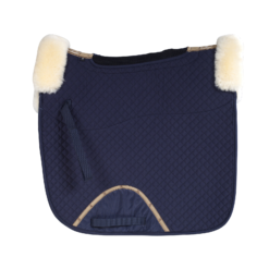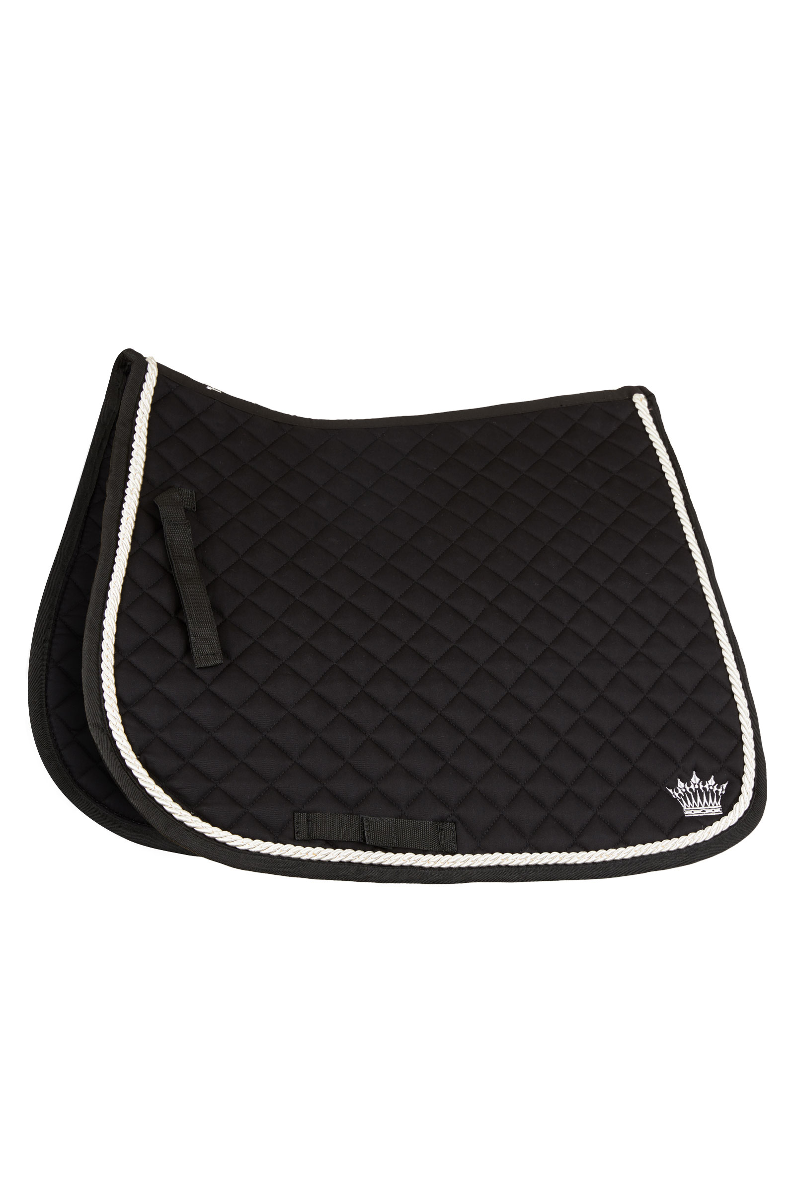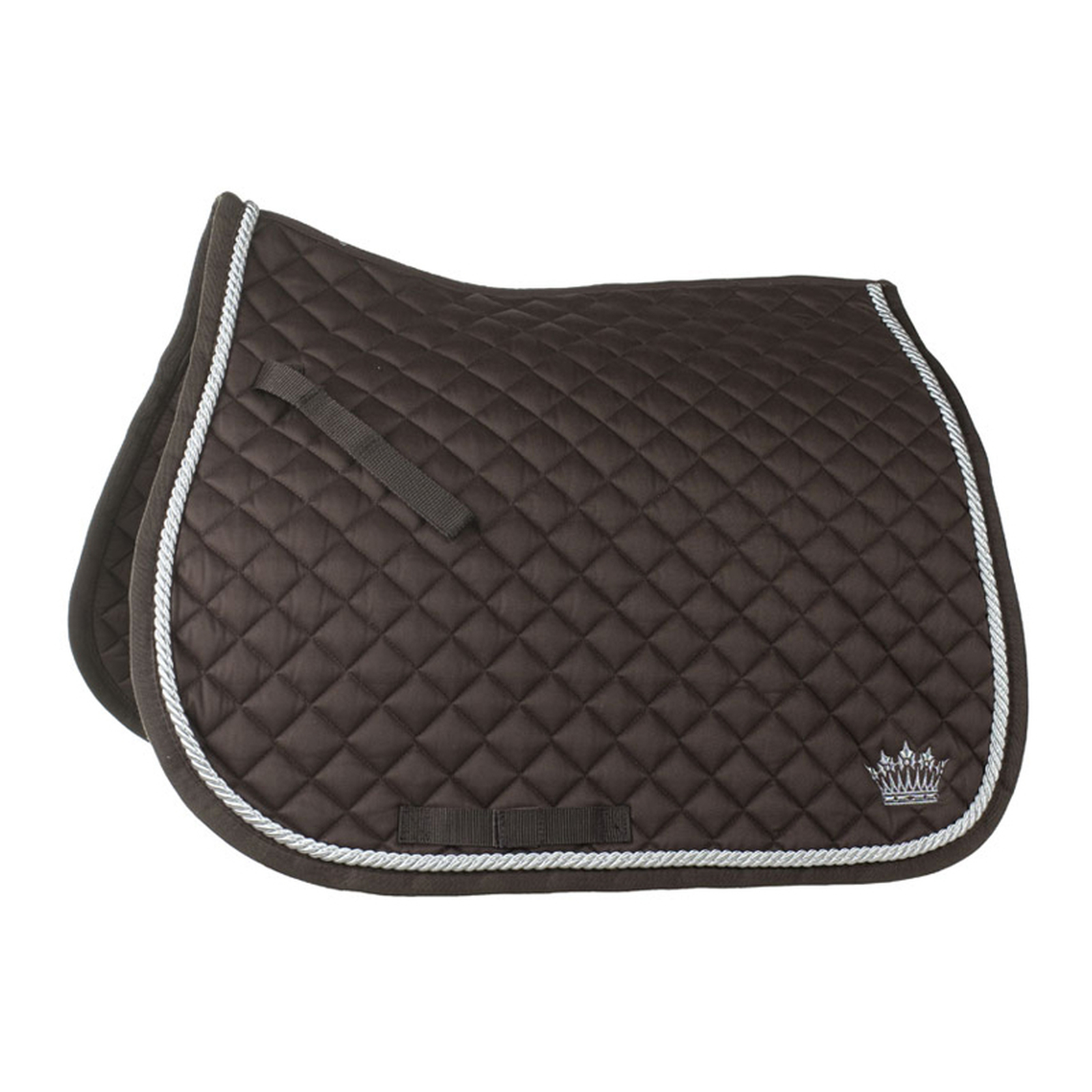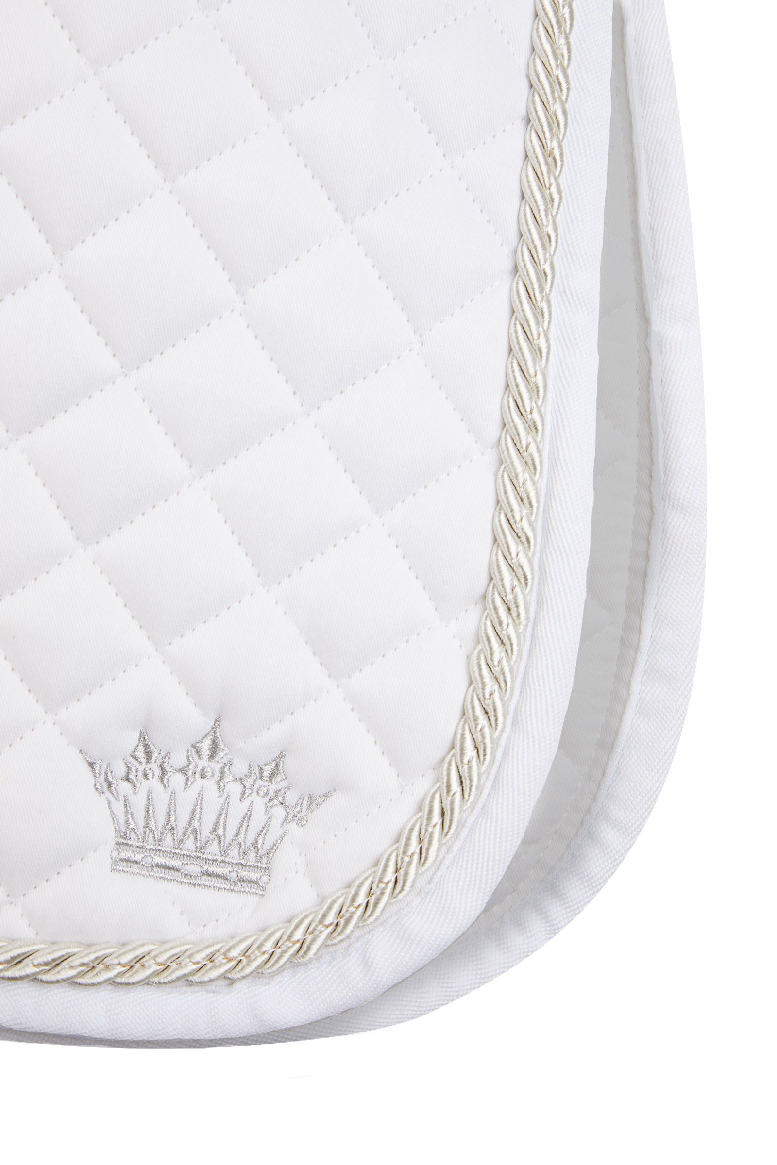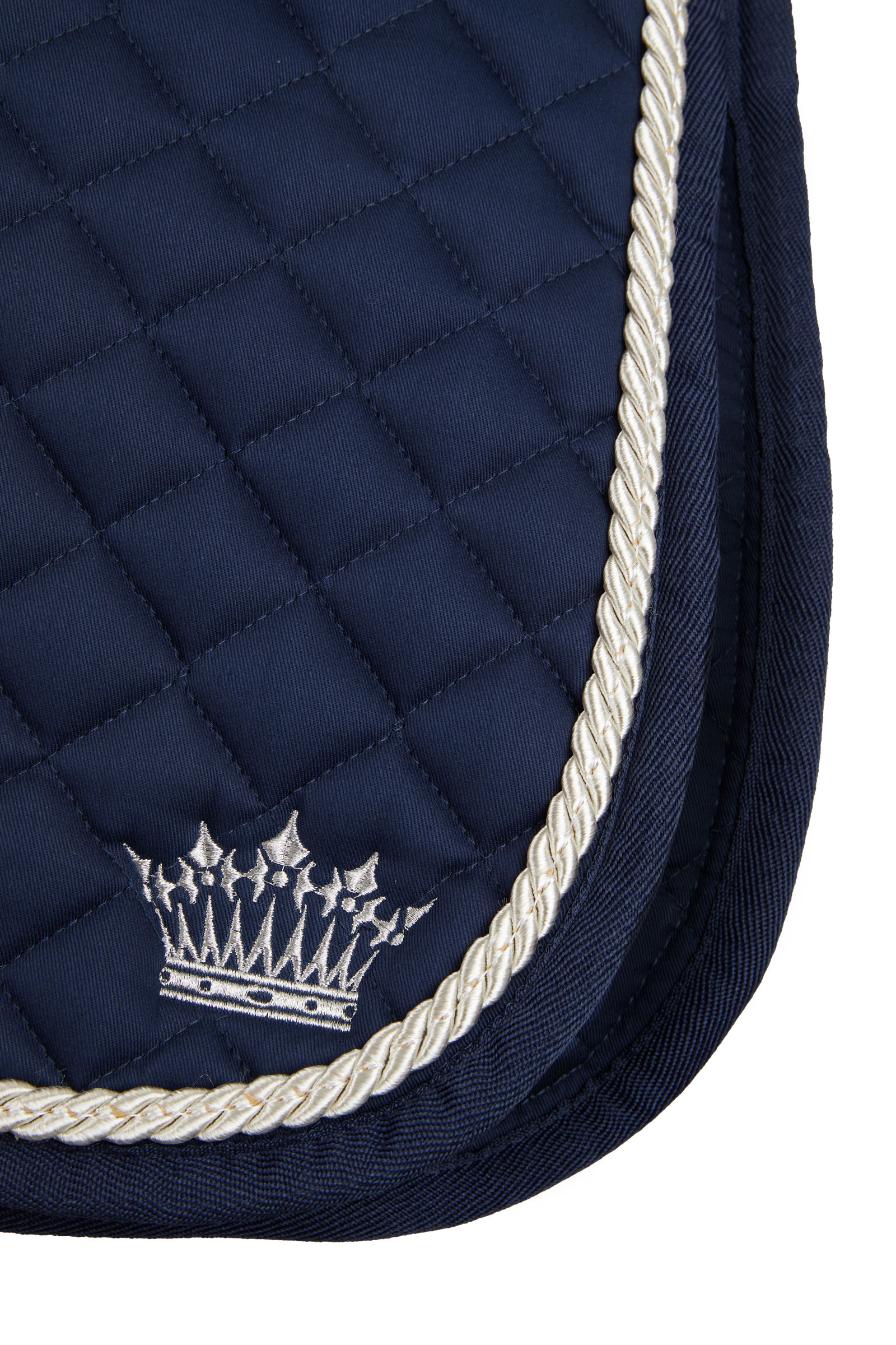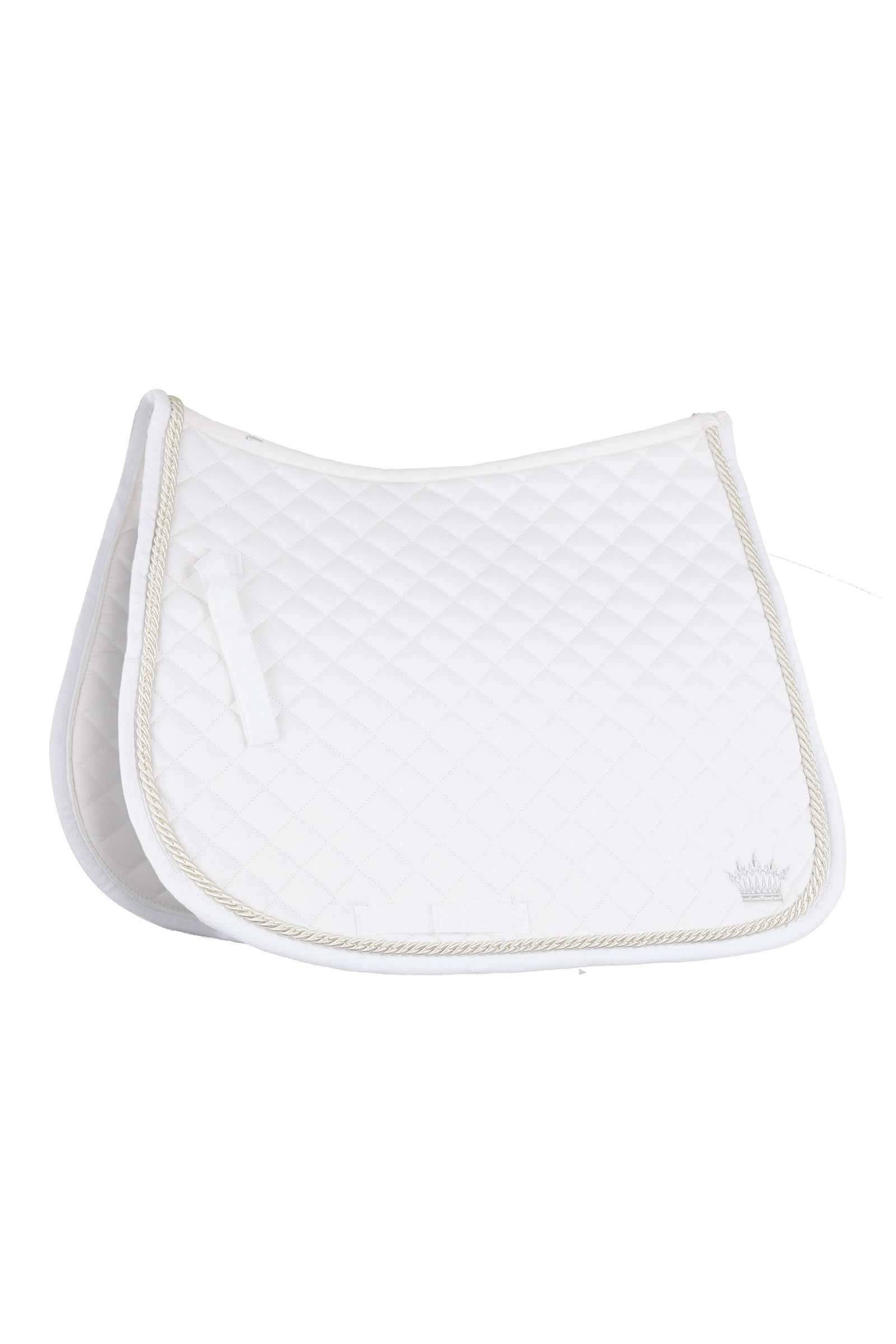 Strong, sturdy silver cord surrounds the border of this attractive all purpose saddle pad. The beautiful diamond quilt pattern, ergonomic shape and impeccable attention to detail set this pad apart from the others. This pad acts as a protective barrier between the saddle and horse’s back. This pad is luxuriously soft with breathable cotton lining to wick away moisture from his back for cool comfort. The contoured pad follows the horse’s natural shape to eliminate rubbing and friction adding extra relief around the withers for enhanced comfort. A silver embroidered crown sits on the bottom corner to match the silver cord trim. Your horse will be the envy of the barn wearing this sharp saddle pad! It will look custom with your name or initials embroidered on it!