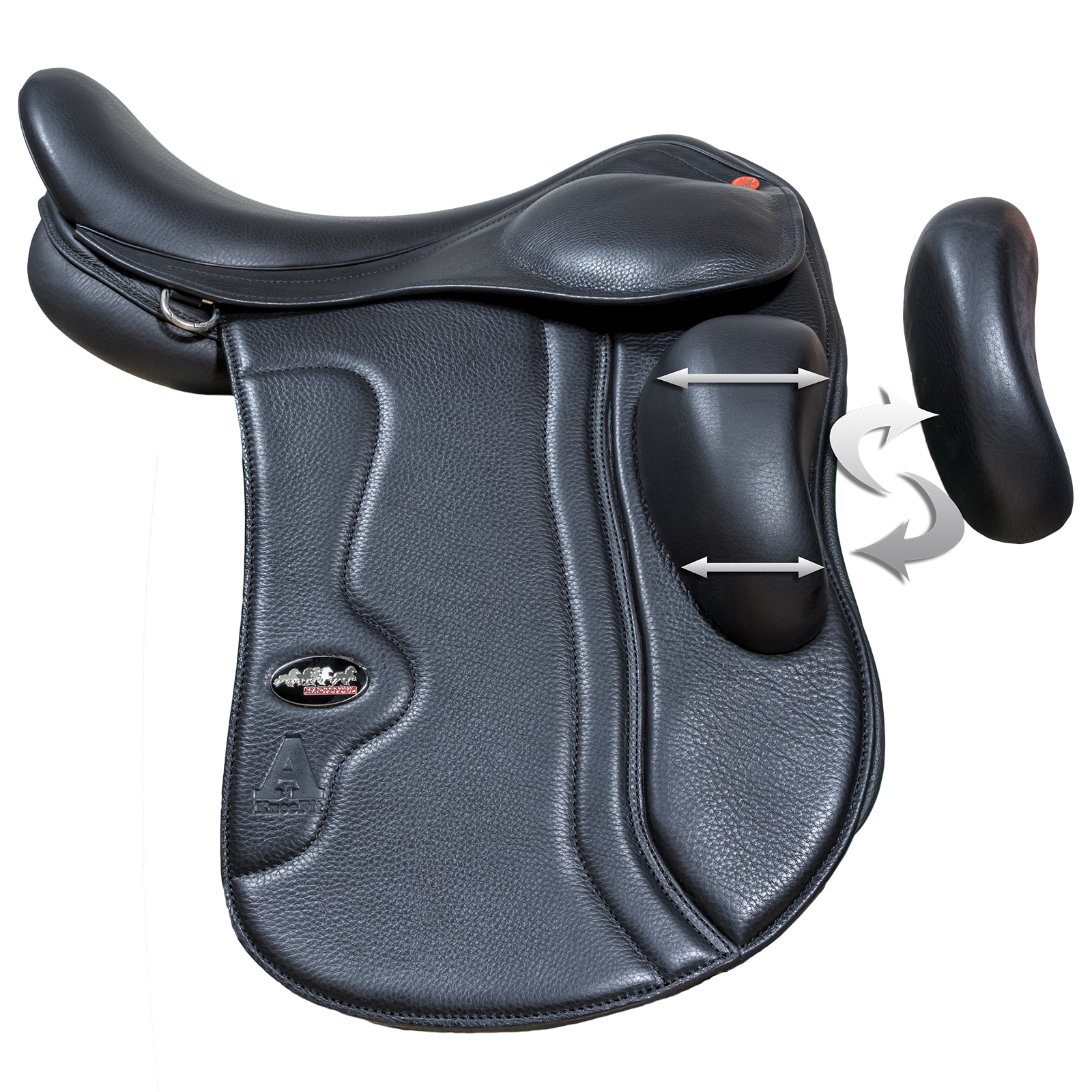 A very nice saddle with adjustable and exchangeable knee rolls, as well as exchangeable gullet iron, in a very flexible high-tech synthetic saddle tree, with great shock absorption and weight distribution. The knee rolls are fastened with screws, which makes it easy to adjust the angle and position, as well as exchange the knee rolls for a different model. Two sets of knee rolls are included. The seat has a very comfortable padding, and has good support for the rider, as well as a good freedom of movement for the rider. Panels with a special shoulder freedom cut, help ensure optimal leg action and also promote a good contact between horse and rider. The saddle has a modern flocking with multiple layers of latex, which adapts to the shape of the horse, and distributes weight optimally. The wide channel, along with a special back cut at the front of the flaps, provides a good freedom for the horses spine, as well as scapulae, which promotes a good back swing of the horse, which in turn stimulates larger leg action. Made in top quality european leather. Includes saddle cover. 2 long girth straps with a Y-system.