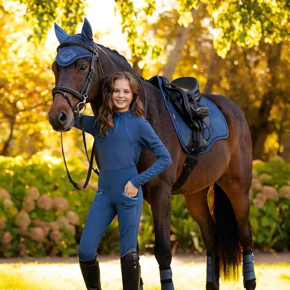 The LeMieux Suede GP Saddle Pad Atlantic is a beautiful blue and brand new LeMieux colour for AW23. This LeMieux saddle pad is a GP style, which will neatly sit under your general purpose saddle. Team the Atlantic GP saddle pad with matching LeMieux Atlantic fly hood and polo bandages for a striking matchy set, which will look super smart on a range of horse colours.