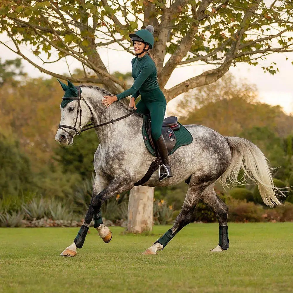 The LeMieux Suede GP Saddle Pad Spruce is a classic general purpose saddle pad, which has been stylishly updated in gorgeous green Spruce for AW23. This LeMieux Saddle Pad is packed full of your favouite LeMieux features, including PU leather girth protection area, soft suede binding and LeMieux’s new modern brick quilt design. Team this suede saddle pad with matching LeMieux Spruce hat silk, base layer, fly hood and polo bandages for the ultimate matchy matchy set!