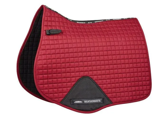 The WeatherBeeta Prime All Purpose Saddle Pad Maroon is a durable cotton saddle pad that has been specifically designed to suit a wide range of general purpose GP saddles. The WeatherBeeta Prime Saddle Pad features a wicking lining that helps keep your horse cool, dry and comfortable while exercising. Features: Breathable mesh spine for extra airflow, PVC-covered girth patch for durability, high-wither design. The WeatherBeeta Prime All Purpose Saddle Pad comes in a striking Maroon colour and is also available in a wide range of other colours.