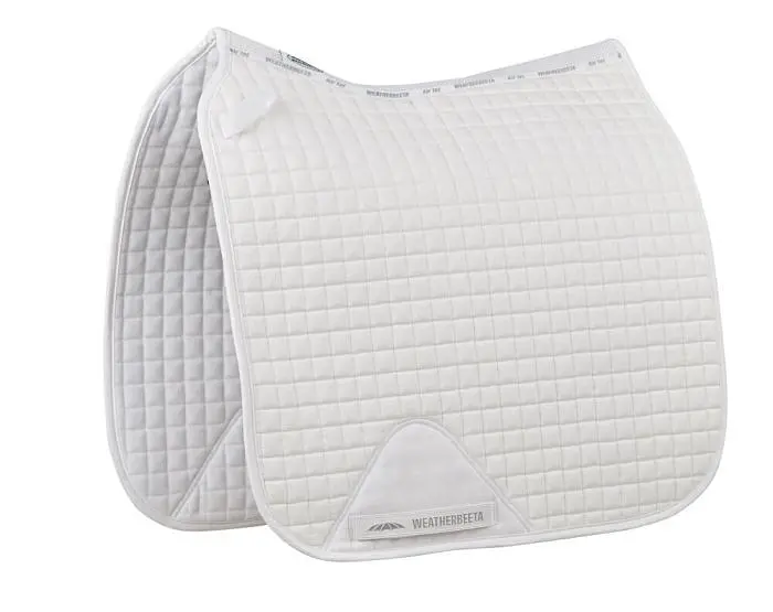The WeatherBeeta Prime Dressage Saddle Pad White is a durable cotton saddle pad that has been specifically designed to fit a large range of Dressage saddles. Made with a wick easy lining, the WeatherBeeta Prime Dressage Saddle Pad helps your Horse stay cool, dry and comfy while exercising. Features: breathable mesh spine for extra airflow, PVC-covered girth patch for added durability, high-wither design. The WeatherBeeta Prime Dressage Saddle Pad comes in classic White and is also available in a wide variety of other colours.