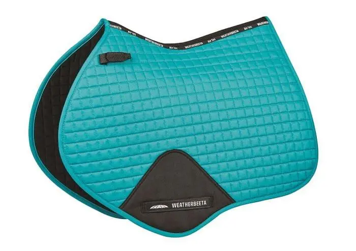 The WeatherBeeta Prime Jump Saddle Pad Turquoise is a durable cotton saddle pad shaped in a sleek and flattering style to fit most jumping saddles. The WeatherBeeta Prime Jump Saddle Pad features a wicking lining that helps to keep your Horse cool, dry and comfy. Features: Breathable mesh spine for extra airflow, PVC-covered girth patch for added durability, high wither design. Comes in a bright and bold Turquoise colour, and also available in a large range of other colours.